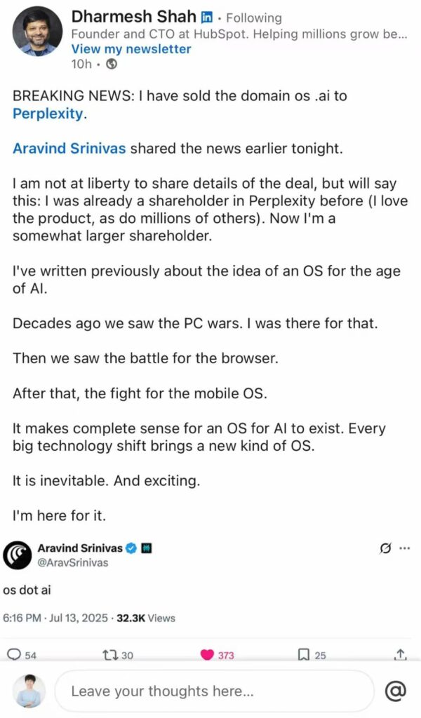 According to dharmesh, co-founder of HubSpot and founder of Agent.ai, the os.ai domain name has been sold to Perplexity! He said that the specific transaction details are not convenient to disclose too much, and said that he was a shareholder of Perplexity before, and now he has become a larger shareholder.