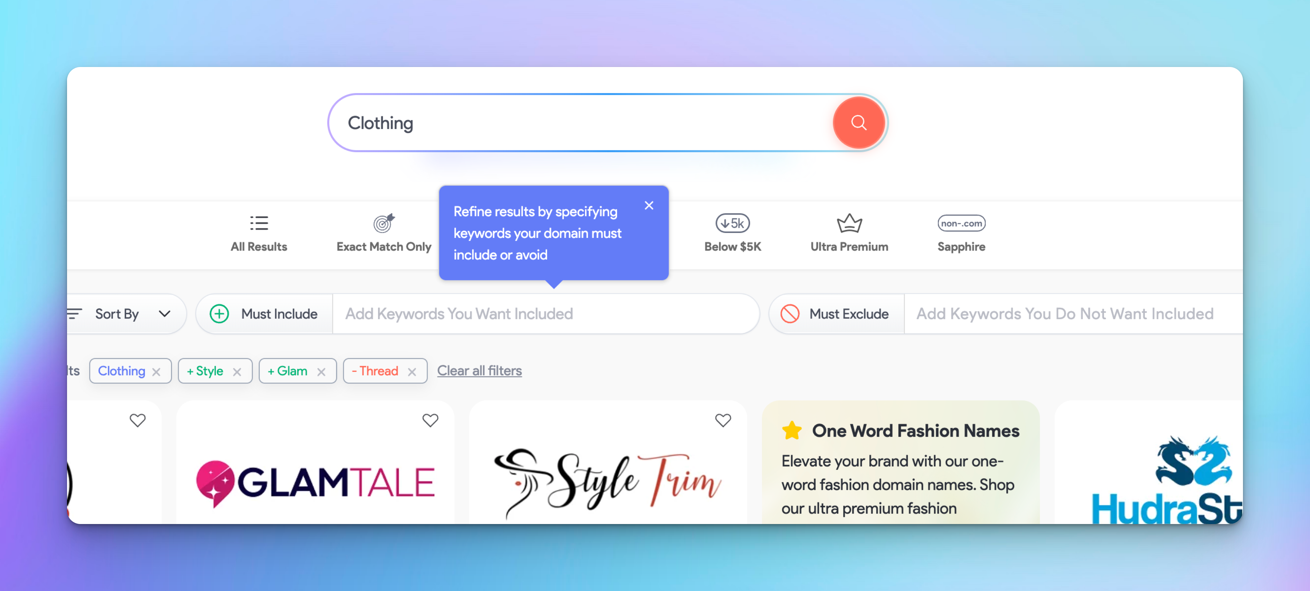 Fashion & Apparel: A buyer searching for “clothing” might see a variety of results with words like “Glam,” “Style,” and “Thread”. If they prefer sleek, modern branding, they can require “Glam” and “Style” while excluding “Thread,” removing results that don’t fit their vision.